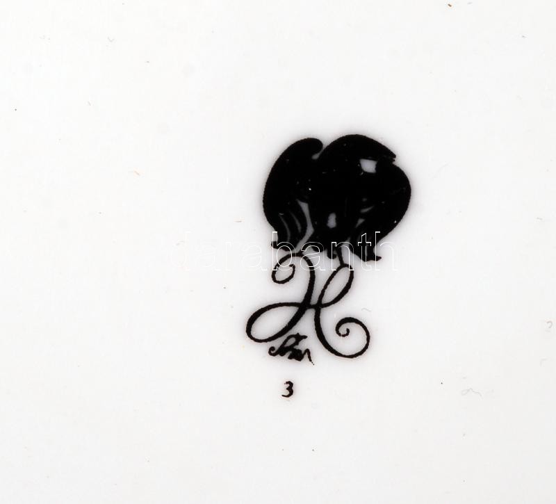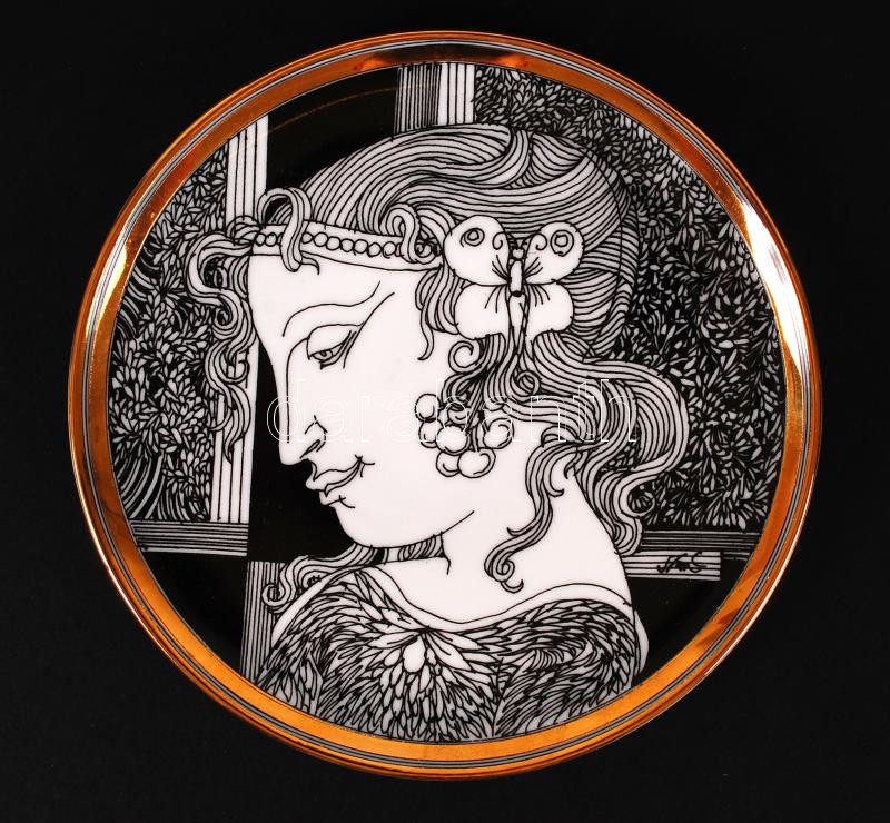 Szász Endre által tervezett aranyozott jelzett Hollóházi porcelán dísztányér az "Arcok" sorozatból, eredeti dobozában /