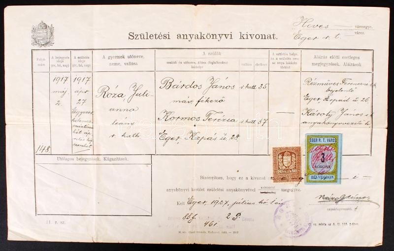 Beschreibung: 1927 Eger R. T. város születési anyakönyvi kivonat 3K egri okmánybélyeggel + 80f okmánybélyeggel
