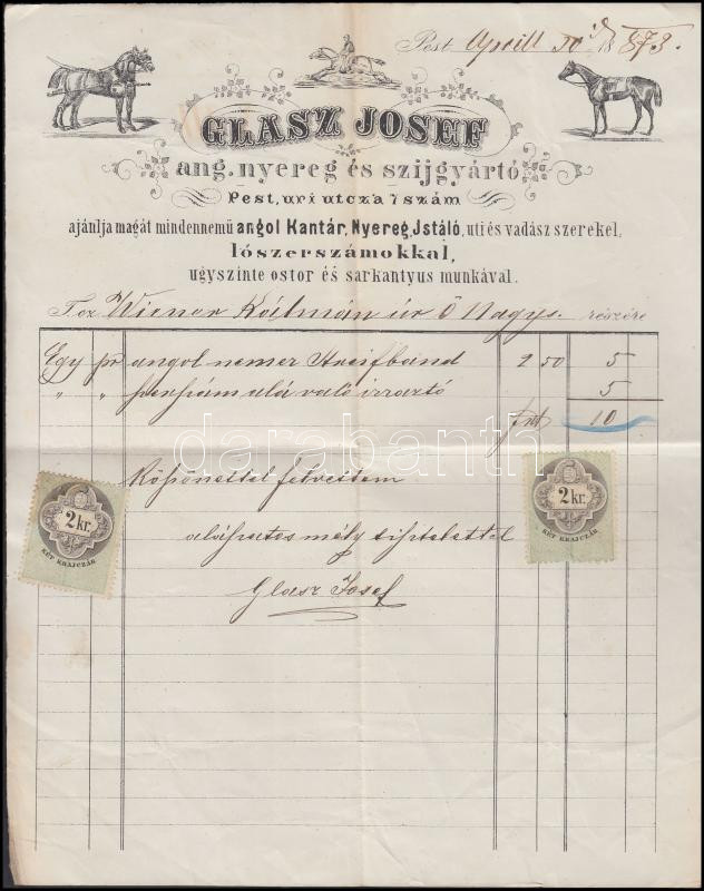 Beschreibung: 1873 Pest V., Glasz József angol nyereg és szíjgyártó által kiállított díszes fejléces számla 2 kr + 2 kr illetékbélyeggel