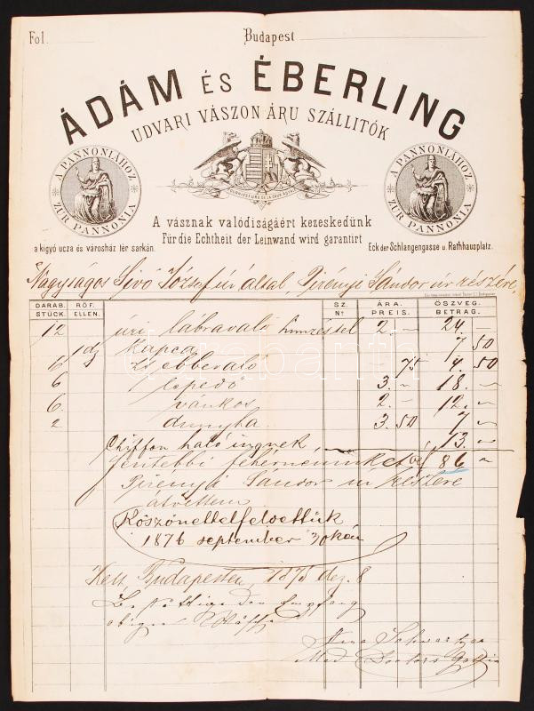 1878 Bp., V. Ádám és Éberling udvari vászon áru szállítók által kiállí... https://www.darabanth.com/de/211-Fernauktion/211.0/Andere-Sammelgebiete/Werbungen~400346/1878-Bp-V-Adam-es-Eberling-udvari-vaszon-aru-szallitok-altal-kiallitott-szamla~II869675