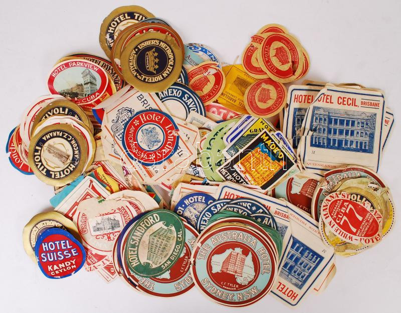cca 1920-1940 Hatalmas háború előtti hotelcímke és bőröndcímke anyag. Több száz darab, nagyrészt sérült és rossz állapotú címke a világ minden tájáról, rengeteg érdekességgel / cca 1920-1940 Severly damaged collection of luggage labels from all around the world. Many hundreds some with greater, some with smaller defects