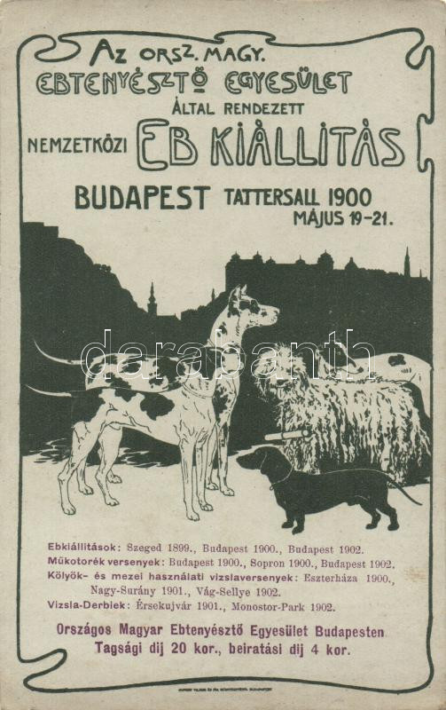 Beschreibung: 1900 Budapest, az Országos Ebtenyésztő Egyesület által rendezett Nemzetközi Eb Kiállítás, reklám (ázott / wet damage)
