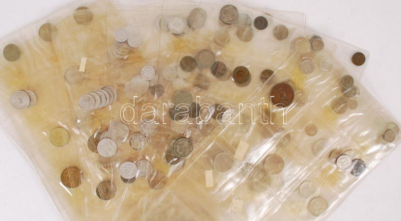 Beschreibung: Több száz vegyes külföldi fémpénzből álló gyűjtemény összefűzetlen berakólapokon borítóval, közte néhány magyar telefonérme T:vegyes