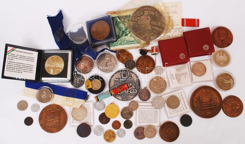 Beschreibung: Vegyes numizmatika tétel kis dobozban fémpénzekkel, emlékérmékkel, kitűzőkkel és bankjegyekkel T:vegyes