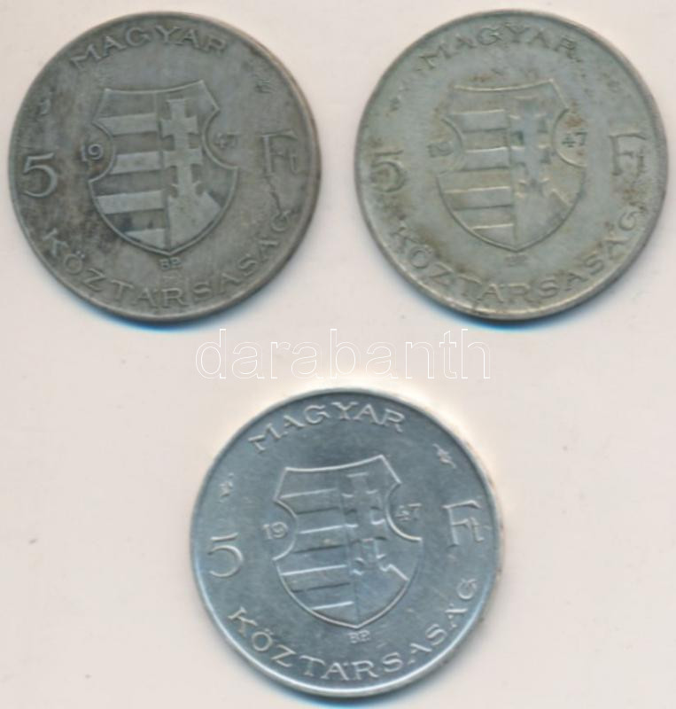 1947. 5Ft Ag "Kossuth" (3x) T:2,2- https://www.darabanth.com/de/211-Fernauktion/211.0/Numismatik/Ungarische-Munzen~600008/1947-5Ft-Ag-Kossuth-3x-T2-2-~II876023