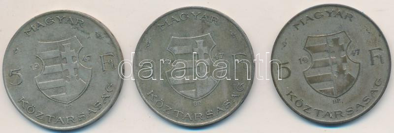 1947. 5Ft Ag "Kossuth" (3x) T:2-,3 https://www.darabanth.com/de/211-Fernauktion/211.0/Numismatik/Ungarische-Munzen~600008/1947-5Ft-Ag-Kossuth-3x-T2-3~II875871
