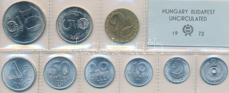 1973. 2f-10Ft 9db klf érmés forgalmi sor fóliatokban T:1 https://www.darabanth.com/de/211-Fernauktion/211.0/Numismatik/Ungarische-Munzen~600008/1973-2f-10Ft-9db-klf-ermes-forgalmi-sor-foliatokban-T1~II869555