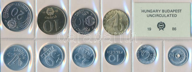 1986. 2f-20Ft 10db klf érmés forgalmi sor fóliatokban T:1 https://www.darabanth.com/de/211-Fernauktion/211.0/Numismatik/Ungarische-Munzen~600008/1986-2f-20Ft-10db-klf-ermes-forgalmi-sor-foliatokban-T1~II869518