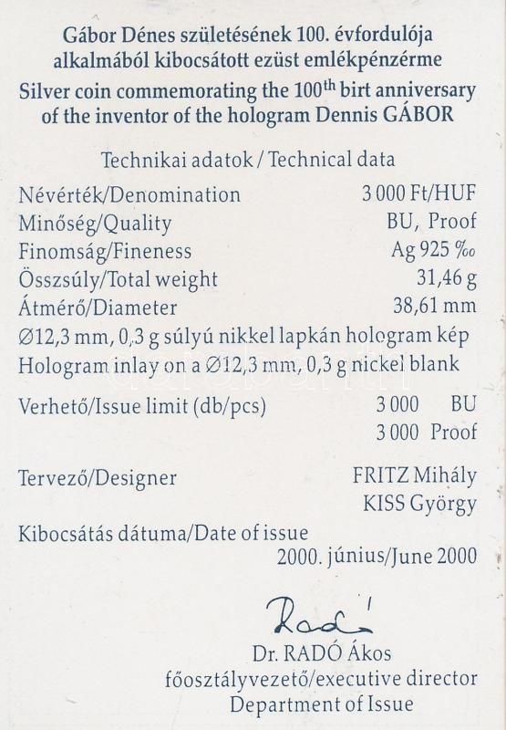 Beschreibung: 2000. 3000Ft Ag "Gábor Dénes" T:PP Tanúsítvánnyal!