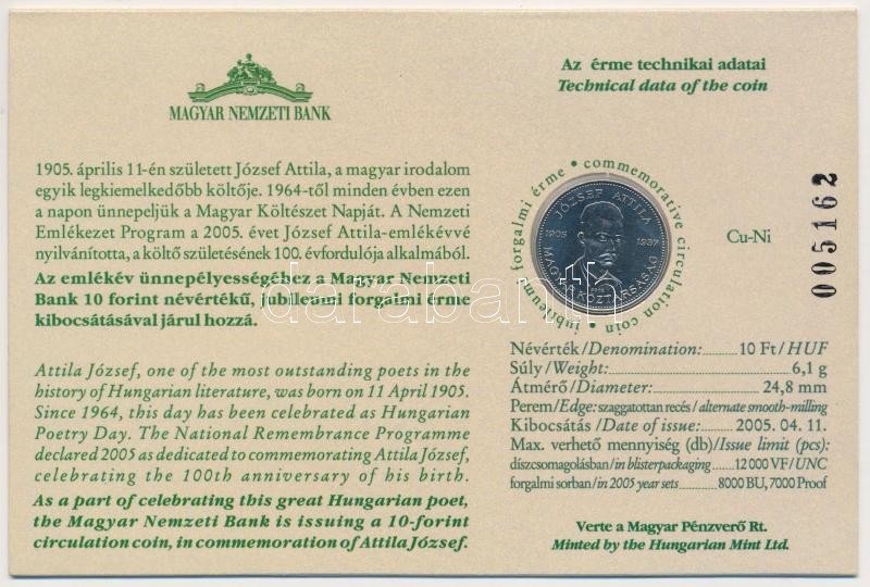 2005. 10Ft "József Attila" sorszámozott emléklapon T:1 https://www.darabanth.com/de/211-Fernauktion/211.0/Numismatik/Ungarische-Munzen~600008/2005-10Ft-Jozsef-Attila-sorszamozott-emleklapon-T1~II873199