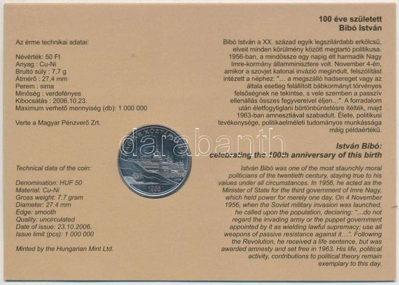 2006. 50Ft "100 éve született Bibó István" emlékkiadás emléklapon T:1 https://www.darabanth.com/de/211-Fernauktion/211.0/Numismatik/Ungarische-Munzen~600008/2006-50Ft-100-eve-szuletett-Bibo-Istvan-emlekkiadas-emleklapon-T1~II875069