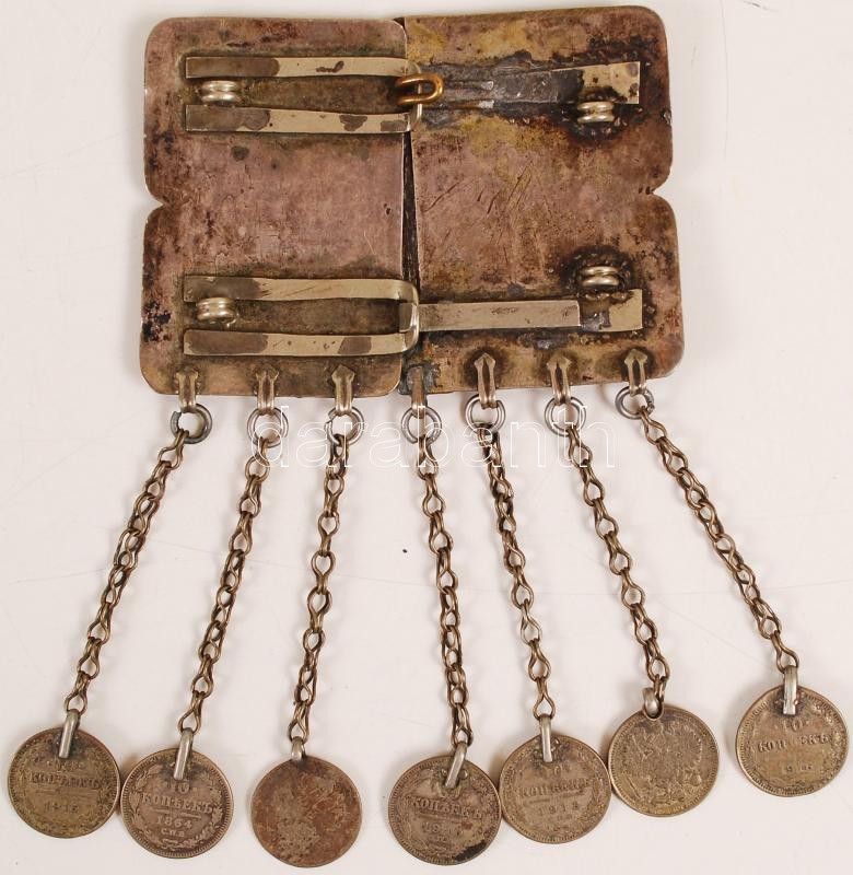 Beschreibung: Antik orosz niello díszítésű övcsat, részben ezüst(Ag.), jelzés nélkül, 7 db 10 kopejkással, 6×8 cm