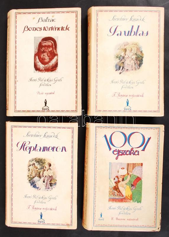 Beschreibung: Szerelmes századok 4 kötet-Forró Pál és Szini Gyula(szerk.): Heptameron, a navarrai királynő elbeszélései; 1001 éjszaka; Faublas; Balzac: Borsos történetek. Kiadói félvászon kötés, színezett lapszélek, kissé kopottas állapotban.