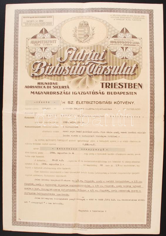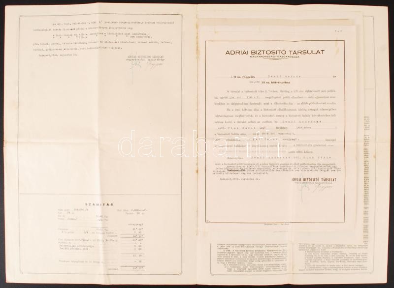 1937 Adriai Biztosító biztosítási kötvény szerződésekkel https://www.darabanth.com/de/212-Fernauktion/212.0/Andere-Sammelgebiete/Dokument~15/1937-Adriai-Biztosito-biztositasi-kotveny-szerzodesekkel~II827109