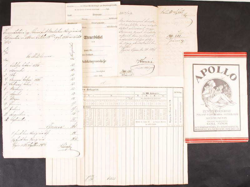 Beschreibung: cca 1860-1932 Vegyes nyomtatványok, iratok (Apollo zenemű-folyóirat, kották, adókönyv, kimutatás). + egyéb egészségügyi bejelentő papírok