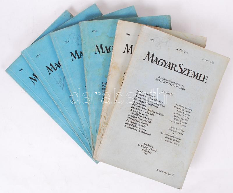 1935 Bp., A Magyar Szemle 6 db száma (febr., máj., jún., júl., okt., n... https://www.darabanth.com/de/212-Fernauktion/212.0/Andere-Sammelgebiete/Drucksachen~26/1935-Bp-A-Magyar-Szemle-6-db-szama-febr-maj-jun-jul-okt-nov-a-szerksztobizottsC3~II878569