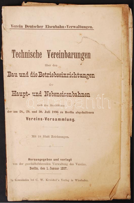 Beschreibung: Vasúttörténeti munka: Technische Vereinbarungen über den Bau und die Betriebseinrichtungen der Haupt und Nebeneisenbahnen... Berlin, 1897. Kriedel 94p
