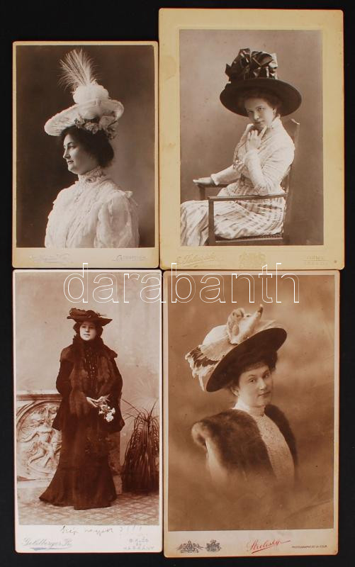 1900-1910 Divattörténeti leletek, a kalapok divatjáról, Szentes, Siklós, Fiume és Budapest egy-egy fényképész műterméből, 4 db keményhátú fénykép, 16x11 és 21x13 cm közötti méretekben