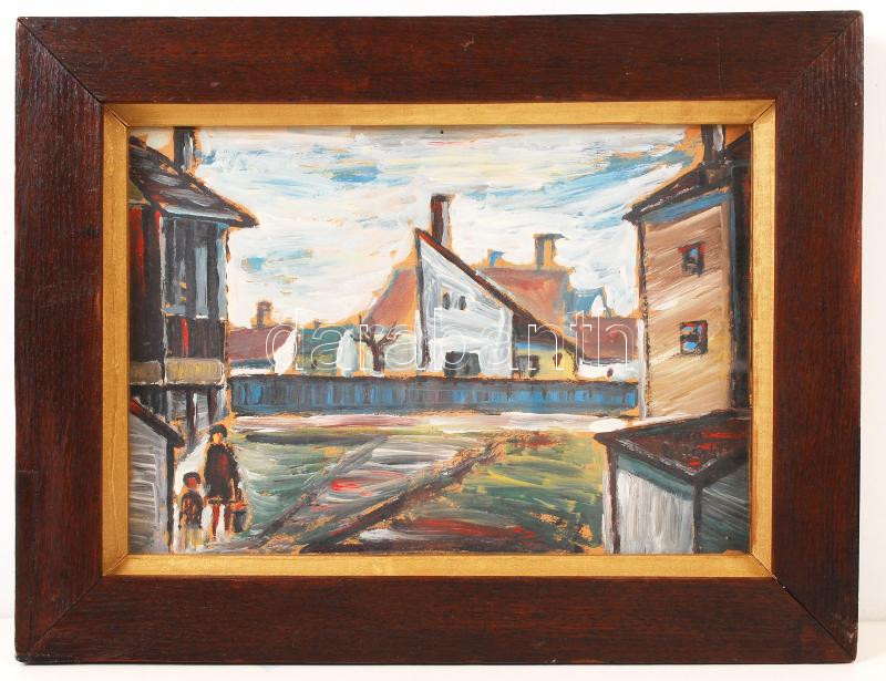 Beschreibung: Jelzés nélkül: Régi házak (Szeged). Olaj, karton, hátul jelzett, üvegezett keretben, 21×28 cm