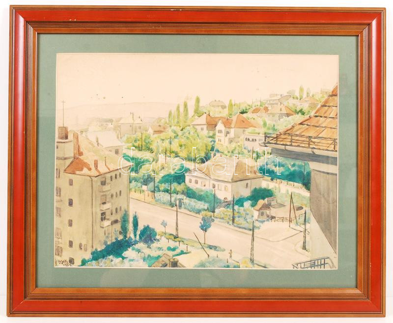 Beschreibung: Ligeti jelzéssel: Budai látkép. Akvarell, papír, üvegezett keretben, 43×32 cm