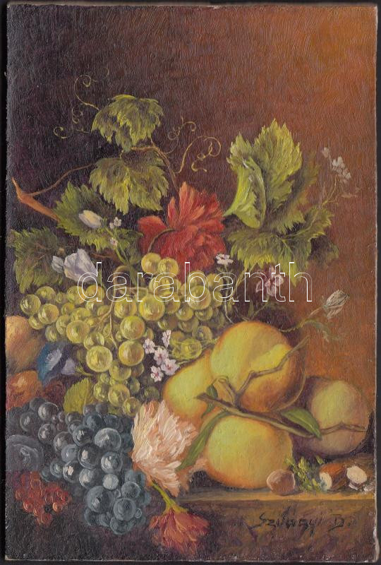 Szilágyi jelzéssel: Gyümölcs csendélet. Olaj, farost, 15×10 cm https://www.darabanth.com/de/212-Fernauktion/212.0/Andere-Sammelgebiete/Gemalde-und-Grafiken~1/Szilagyi-jelzessel-Gyumolcs-csendelet-Olaj-farost-15C39710-cm~II879240