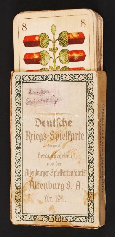 1916 Háborús kártya pakli. Kriegsspielkarte. Hiánytalan csomag, a lapokon hadi eseményekkel és a központi hatalmak vezéregyéniségével. Kopott lapok, eredeti dobozban. / 1916 Military field card. Complete deck of 32 cards in original box