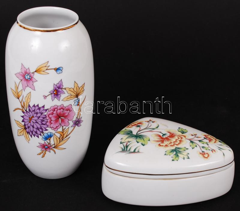 Hollóházi dobozka és váza, matricás, jelzett, hibátlan, m:17 cm, 12×9 ... https://www.darabanth.com/de/212-Fernauktion/212.0/Andere-Sammelgebiete/Porzellan~6/Hollohazi-dobozka-es-vaza-matricas-jelzett-hibatlan-m17-cm-12C3979-cm~II881760