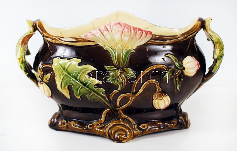Beschreibung: Jelzés nélküli szecessziós kaspó, sérült, csak formaszám, kézzel festett, 12×23 cm, m:14 cm