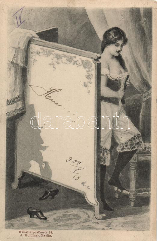 Erotic postcard, Künstlerpostkarte 14. J. Goldiner https://www.darabanth.com/de/212-Fernauktion/212.0/Ansichtskarten/Erotik~600064/Erotic-postcard-Kunstlerpostkarte-14-J-Goldiner~II877087