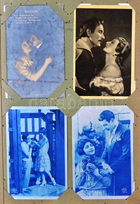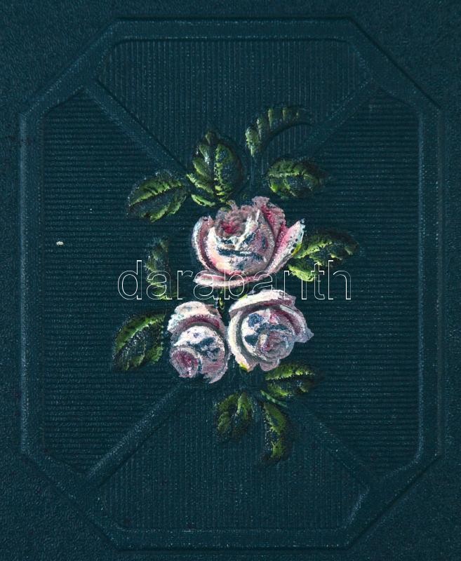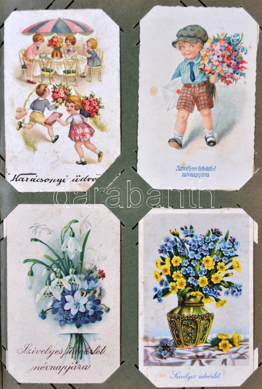 Képeslapalbum 112 férőhellyel, benne 224 db motívum lap, üdvözlő lapok, hölgy motívumú és vallási témájú lapok, néhány litho / Postcard album for 112 postcards, including 224 motive cards, greeting cards, ladies, religion, some litho