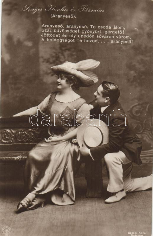 Szoyer Ilonka és Pázmán; Aranyeső https://www.darabanth.com/de/212-Fernauktion/212.0/Ansichtskarten/Schauspielerin~600119/Szoyer-Ilonka-es-Pazman-Aranyeso~II879486