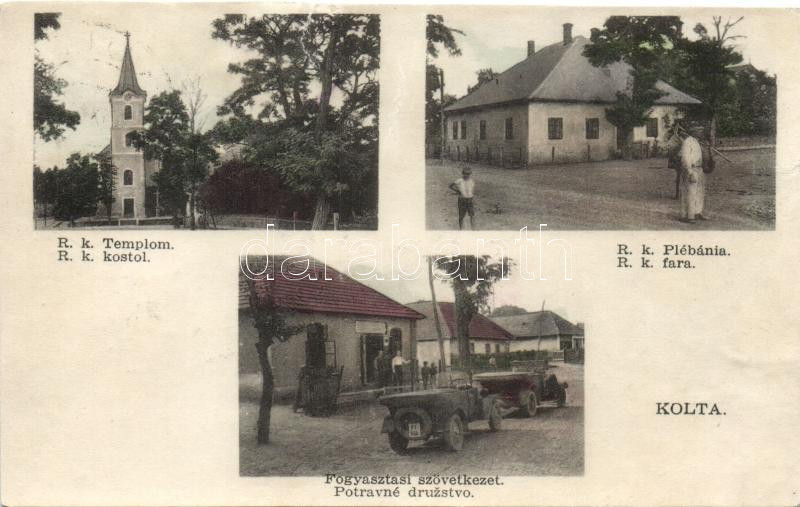 Beschreibung: Kolta, Római katolikus templom és plébánia, Fogyasztási szövetkezet / Roman catholic church, parish, cooperatives, automobile