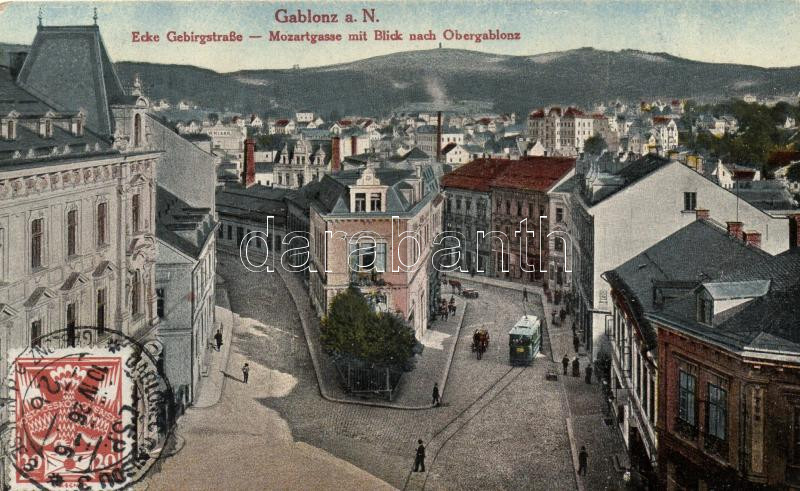 Beschreibung: Jablonec nad Nisou, Gablonz; Gebirgstrasse, Mozartstrasse; Verlag Herm. Rössler / street corner