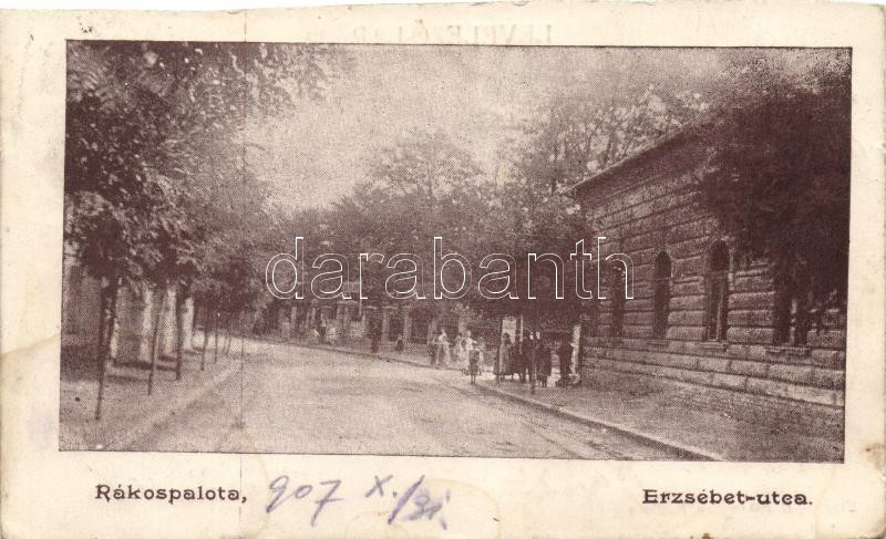 Budapest XV. Rákospalota, Erzsébet utca, Fischer Dezső és társa kiadás... https://www.darabanth.com/de/212-Fernauktion/212.0/Ansichtskarten/Ungarn~48/Budapest-XV-Rakospalota-Erzsebet-utca-Fischer-Dezso-es-tarsa-kiadasa-vagott-cut~II877352