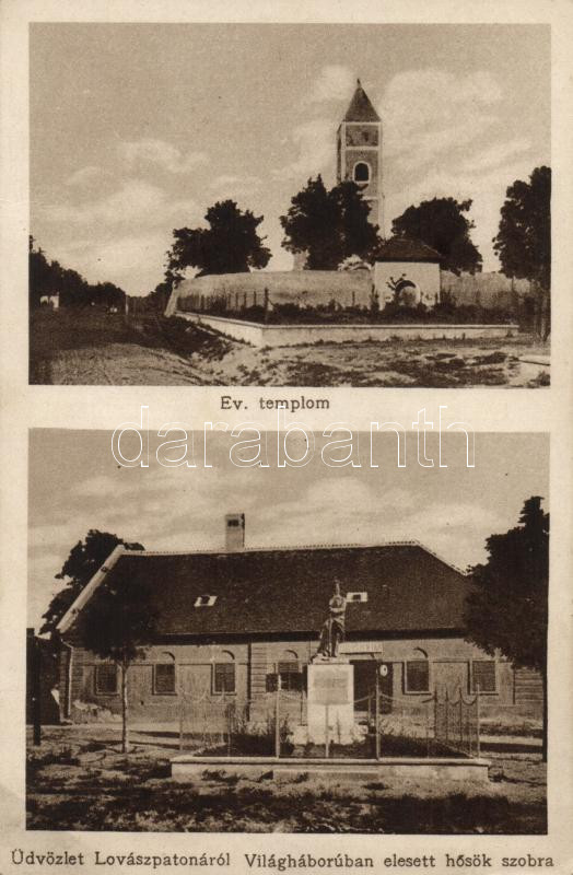 Lovászpatona, Evangélikus templom, Világháborúban elesett hősök szobra... https://www.darabanth.com/de/212-Fernauktion/212.0/Ansichtskarten/Ungarn~48/Lovaszpatona-Evangelikus-templom-Vilaghaboruban-elesett-hosok-szobra-Hangya-kiadasa~II878051