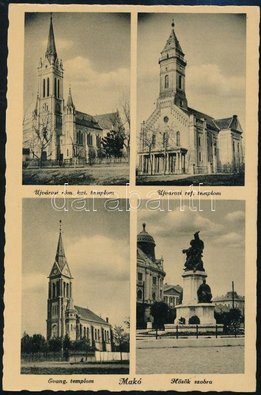 Makó, Újvárosi Római katolikus, Református és Evangélikus templom, Hős... https://www.darabanth.com/de/212-Fernauktion/212.0/Ansichtskarten/Ungarn~48/Mako-Ujvarosi-Romai-katolikus-Reformatus-es-Evangelikus-templom-Hosok-szobra-Rb~II878945