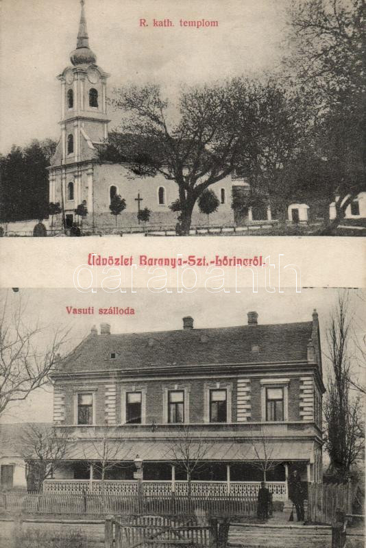 Beschreibung: Szentlőrinc, Baranyaszentlőrinc; Római katolikus templom, vasúti szálloda