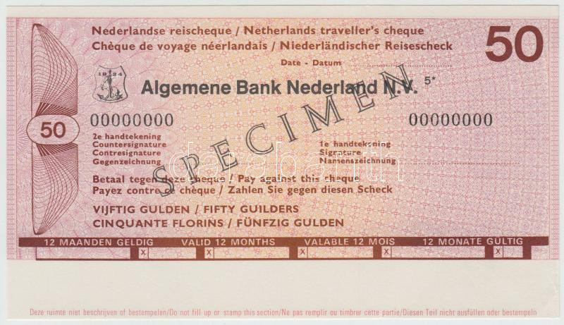 Netherlands ND "Algemene Bank Nederland" 50 Guilders traveller's cheque C:XF (unfolded)
