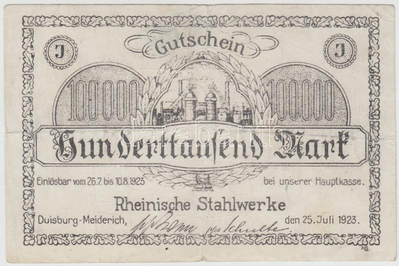 Beschreibung: Német Birodalom / Weimari Köztársaság Duisburg-Meiderich "Rajnai Acélművek" 100.000M utalvány T:III