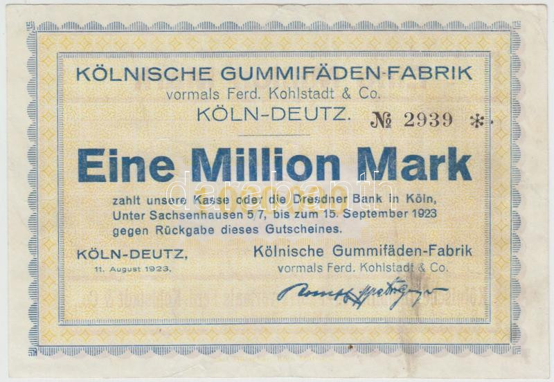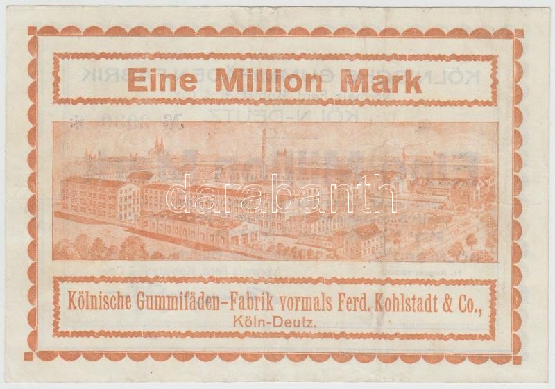 Beschreibung: Német Birodalom / Weimari Köztársaság "Kölni Gumiszálgyár" 1923. 1.000.000M utalvány T:III