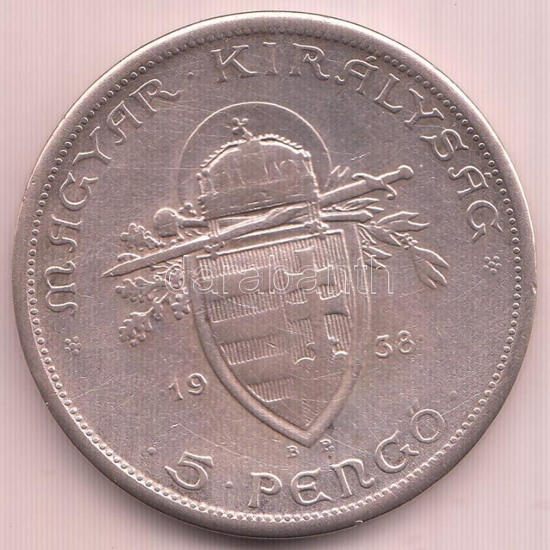 Adamo P8.1 https://www.darabanth.com/de/212-Fernauktion/212.0/Numismatik/Ungarische-Munzen~200008/1938-5P-Ag-Szent-Istvan-T3-3Cbr3EAdamo-P81~II868037