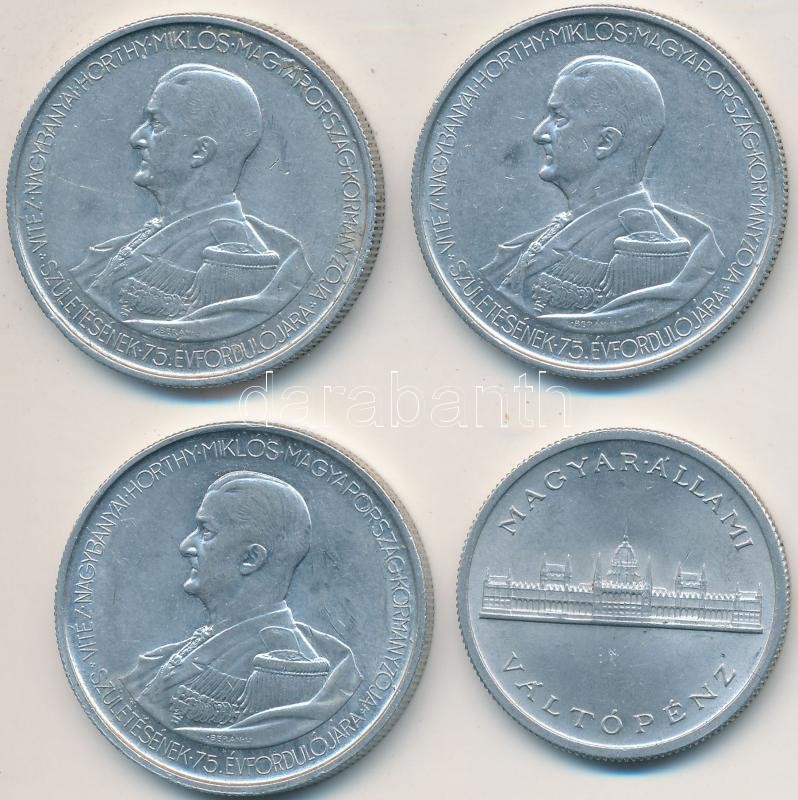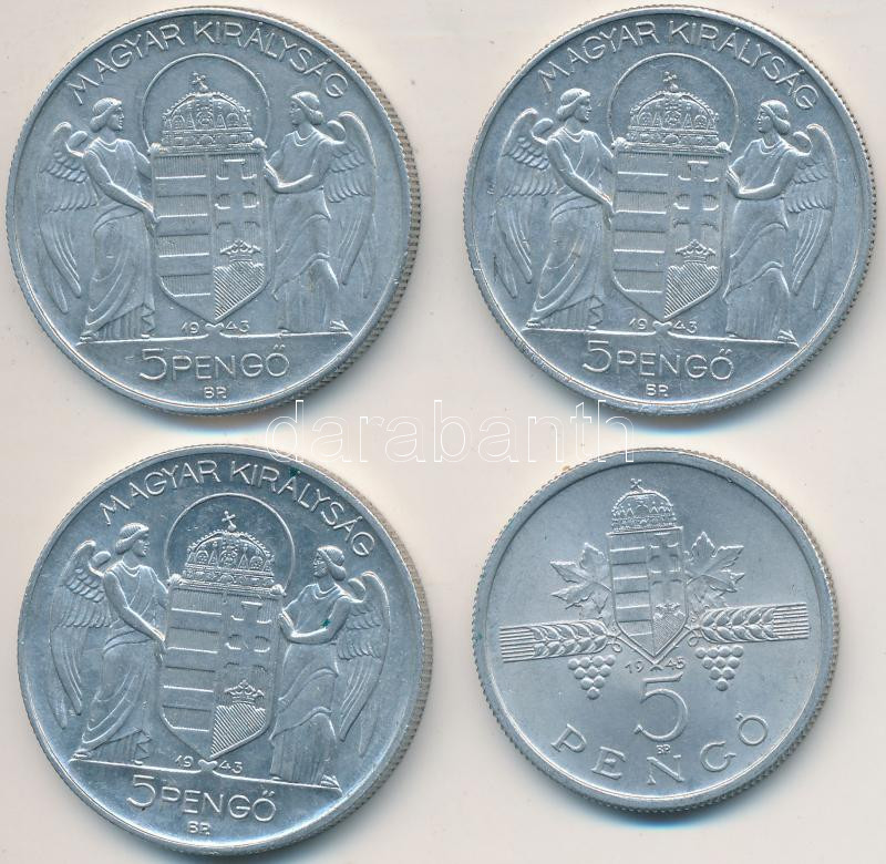 1943. 5P Al "Horthy Miklós születésének 75. évfordulója" (3x) + 1945. ... https://www.darabanth.com/de/212-Fernauktion/212.0/Numismatik/Ungarische-Munzen~200008/1943-5P-Al-Horthy-Miklos-szuletesenek-75-evforduloja-3x-plus-1945-5P-Al-Parlament-T2~II879503