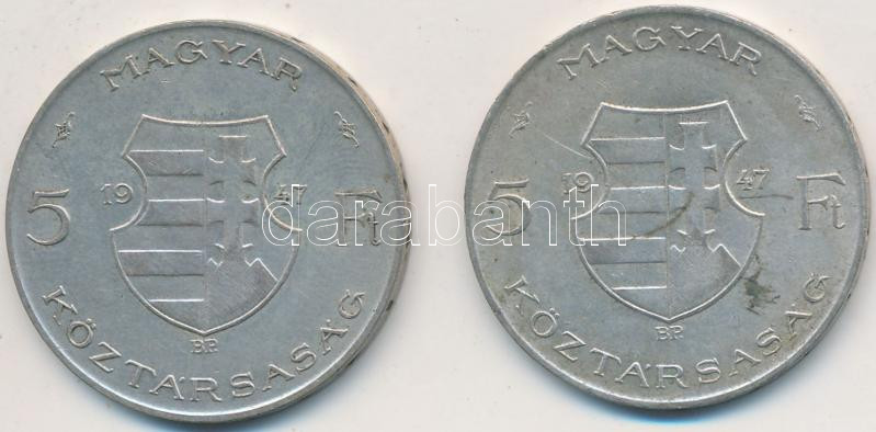 1947. 5Ft Ag "Kossuth" (2x) T:2- https://www.darabanth.com/de/212-Fernauktion/212.0/Numismatik/Ungarische-Munzen~200008/1947-5Ft-Ag-Kossuth-2x-T2-~II868192