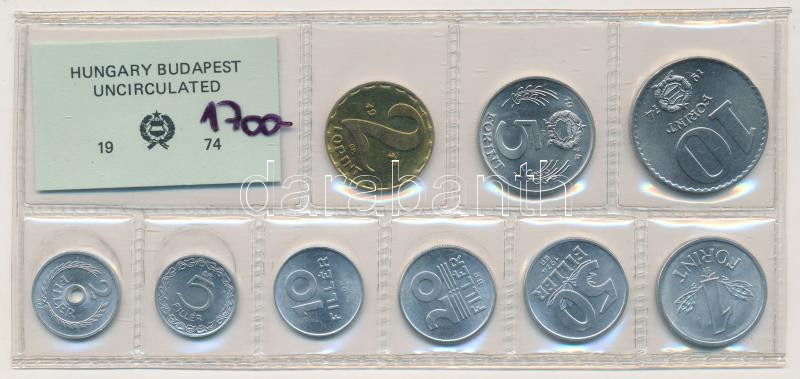 1974. 2f-10Ft 9db klf érmés forgalmi sor fóliatokban T:1 https://www.darabanth.com/de/212-Fernauktion/212.0/Numismatik/Ungarische-Munzen~200008/1974-2f-10Ft-9db-klf-ermes-forgalmi-sor-foliatokban-T1~II879051