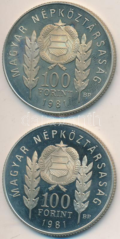 1981. 100Ft "Bulgária 1300 éves" (2x) T:PP https://www.darabanth.com/de/212-Fernauktion/212.0/Numismatik/Ungarische-Munzen~200008/1981-100Ft-Bulgaria-1300-eves-2x-TPP~II877907