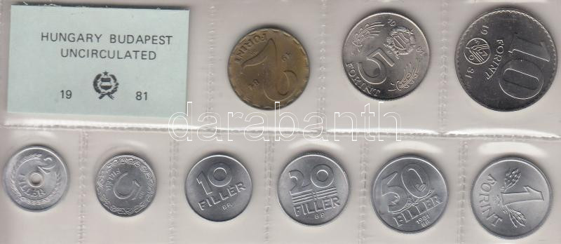 1981. 2f-10Ft 9db klf érmés forgalmi sor sérült fóliatokban T:1 https://www.darabanth.com/de/212-Fernauktion/212.0/Numismatik/Ungarische-Munzen~200008/1981-2f-10Ft-9db-klf-ermes-forgalmi-sor-serult-foliatokban-T1~II879041