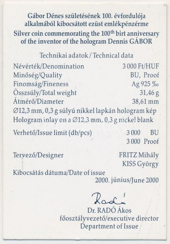 Beschreibung: 2000. 3000Ft Ag "Gábor Dénes" T:PP Tanúsítvánnyal!