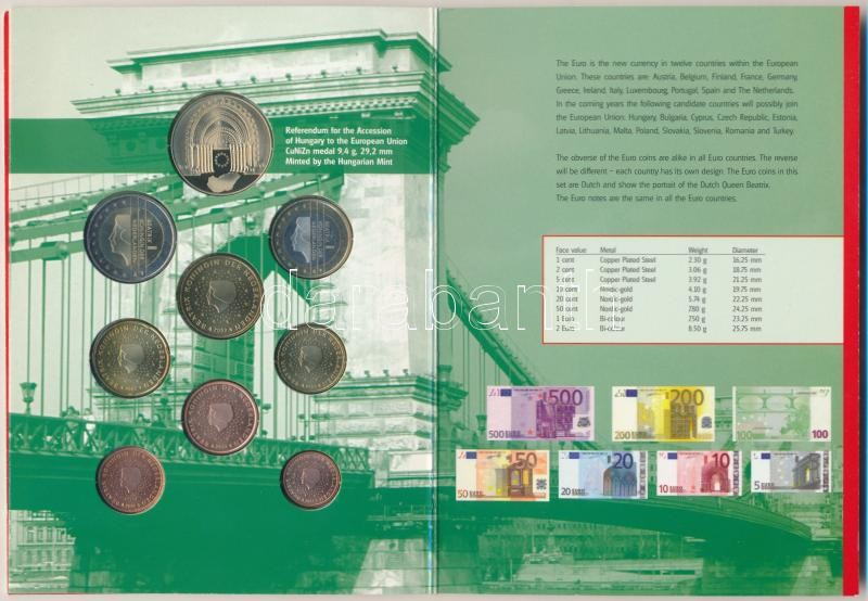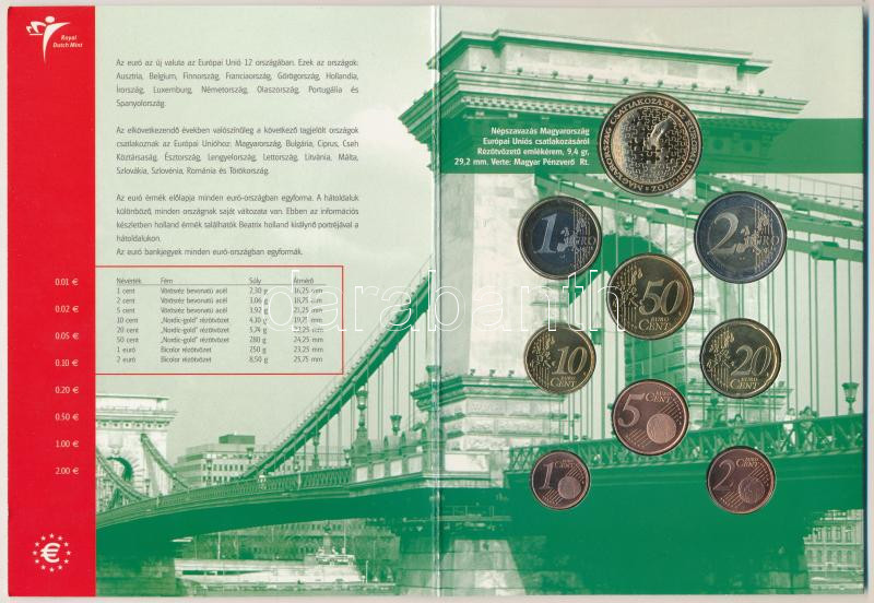 2003. 1c, 2c, 5c, 10c, 20c, 50c, 1€, 2€ próbaveretek + "Népszavazás Magyarország Európai Uniós csatlakozásáról" rézötvözetű emlékérem első hivatalos információs készlet díszkiadásban T:PP