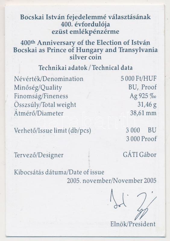 Beschreibung: 2005. 5000Ft Ag "Bocskai István" T:PP Tanúsítvánnyal!