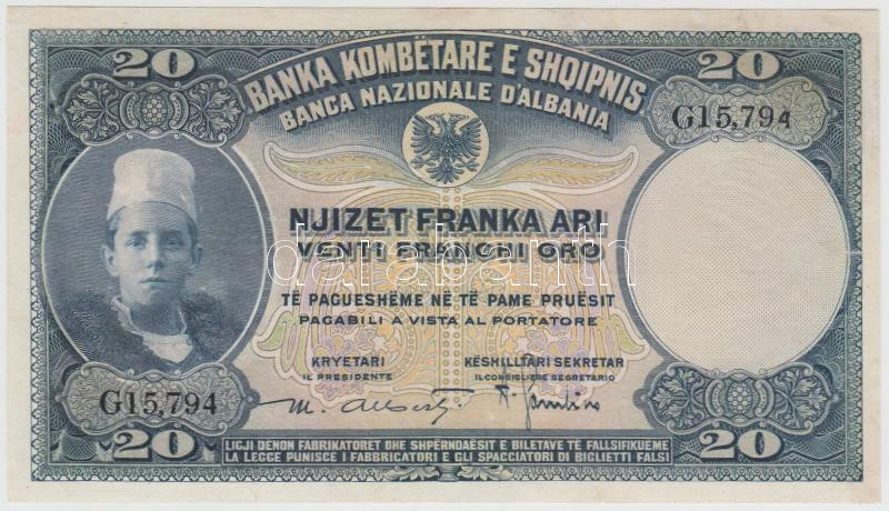 Albania 1926. 20 Franka Ari C:restore... https://www.darabanth.com/de/212-Fernauktion/212.0/Numismatik/Weltweit-Banknoten~200023/Albania-1926-20FA-Trestauralt--3Cbr3EAlbania-1926-20-Franka-Ari-Crestored~II879253